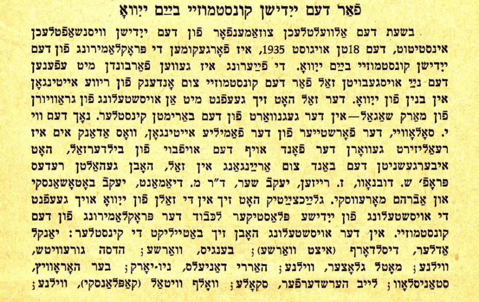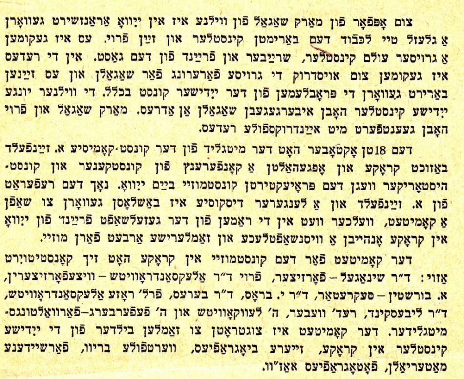 In August 1935, YIVO inaugurated a new art museum, during its international conference, when the YIVO building was full of scholars from around the world, as well as other visitors. As the December 1935 issue of Yedies reported, the ribbon was cut on a new gallery named in honor of Rive Eitingon. The first exhibition was of engravings by Marc Chagall, who was there in person. In fact, Chagall was credited as “the initiator of the art museum, who has promised his active cooperation.” Speeches were delivered by the eminent historian Simon Dubnow, journalist Zalmen Reyzen, Vilna Troupe actor Avrom Morevski, and others. Another gallery featured an exhibition of sculptures by Jewish artists, including works by Yankl Adler, Maurycy Minkowski, and Arthur Szyk.